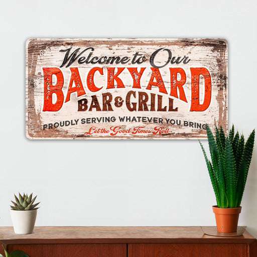 Kitchen Wall Decor - Welcome To Our Backyard Bar & Grill - Metal Sign