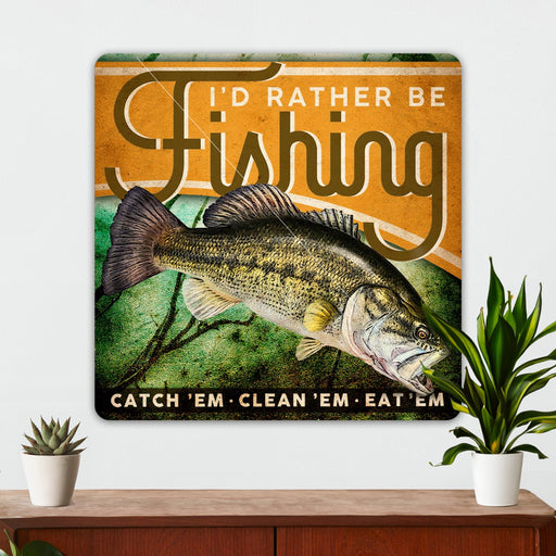 The "I'd Rather Be Fishing" fish camp sign is meant for the fishing fanatic in every group. Perfect for your fishing dock or your river house this decor is made of weather resistant aluminum composite material allowing it to be setup indoors or outdoors! Your honey hole just got a little bit sweeter!